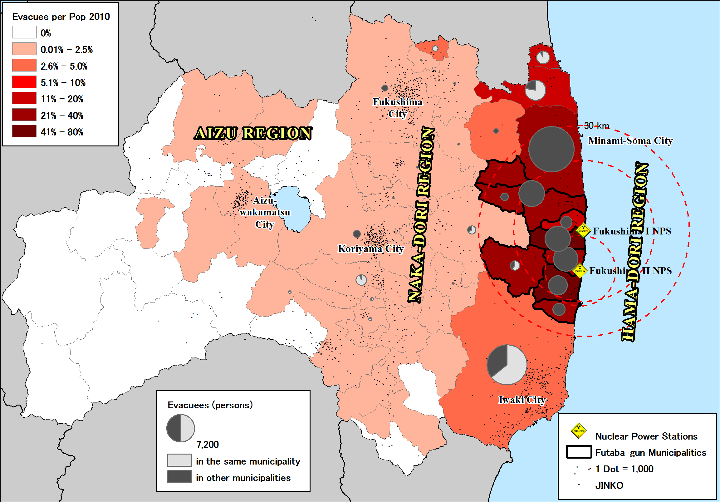Although Fukushima has become a household name for nuclear contamination internationally, the region directly affected by the nuclear crisis is the Hamadori region along the coast, separated by Abukuma Mountains from the more populous Nakadori region. The largest number of evacuees comes from MinamiSoma City (19,052 persons) and Iwaki City (14,735), at the northern and southern end of the 30 km radius zone, respectively. The two cities, despite being hit by tsunami and having considerable number of population outside of Evacuation Order zone, suffered severe lack of resources and help from other regions which lead to now renowned YouTube speech by Katsunobu Sakurai, the mayor of MinamiSoma City. Fukushima I NPS is located in Futaba Gun (or county) or more specifically at Okuma-cho at the northern border to Futaba-cho. The next largest numbers of evacuees come from 8 municipalities in Futaba Gun where most parts are within 30 km radius from the Fukushima I NPS. The municipal function of these 8 municipalities are moved to municipalities in Nakadori region, as almost entire population evacuated from the area.
