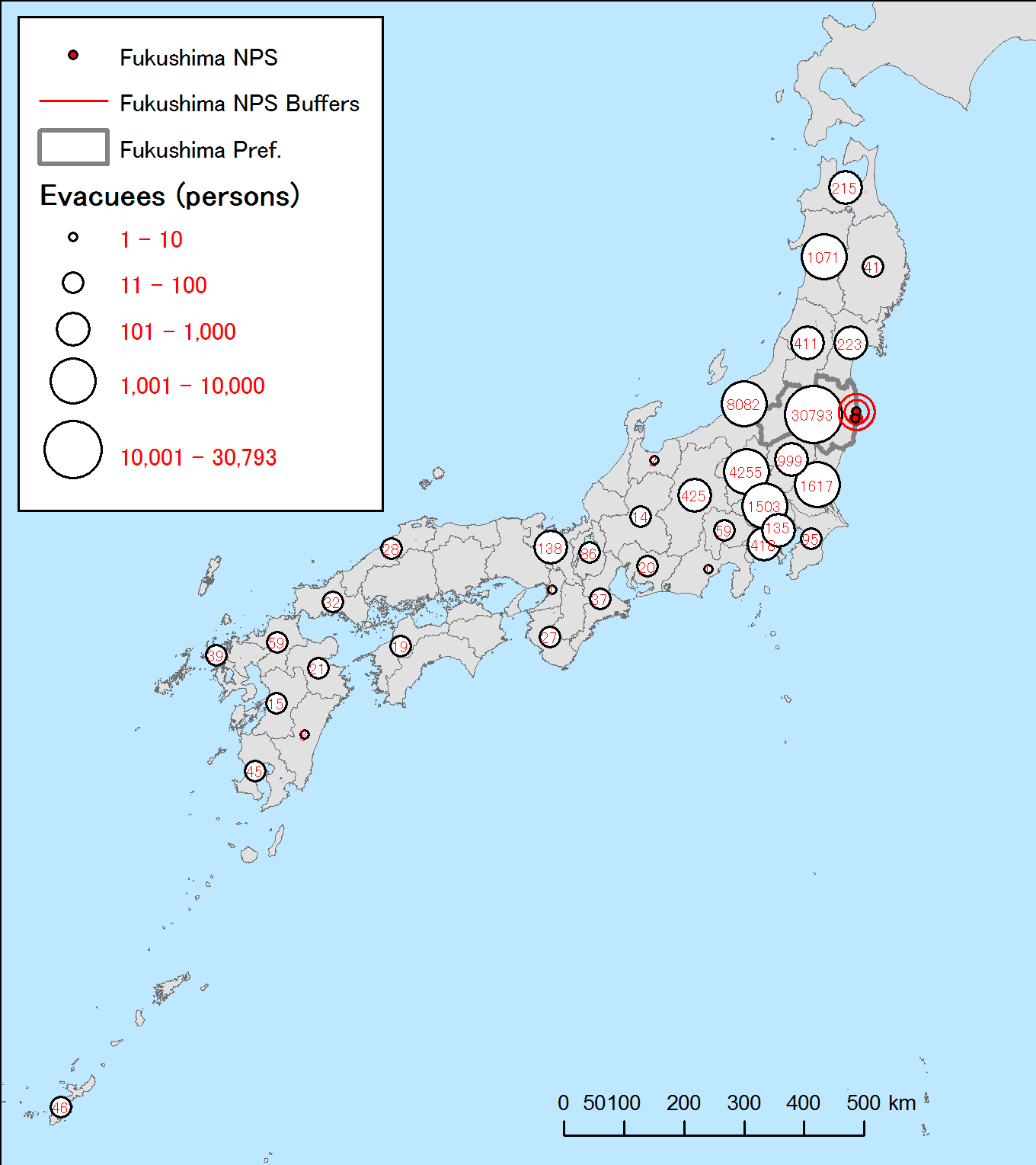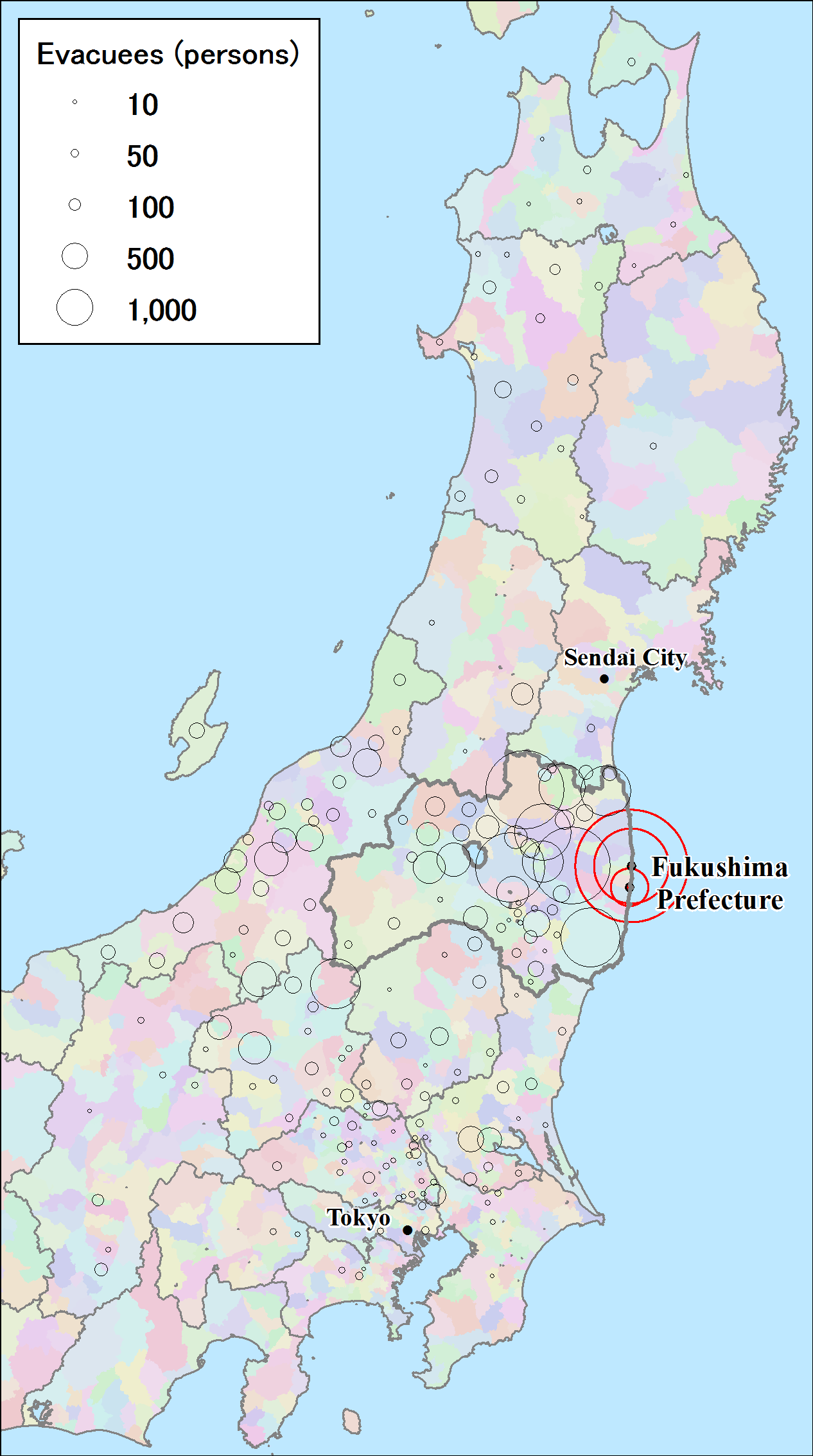 The List contains 80,870 records of which 66,987 from Fukushima Prefecture are not known to have left the evacuation facilities. The list does not tell fully about those who left the facilities but notes written to some records tell that some moved to other evacuation facility, went back home, hospitalized, or adopted by families and relatives therefore many of those who left seem to be still under evacuation in private setting. The remaining evacuees are tabulated by municipality of the usual address and mapped in figure 1.