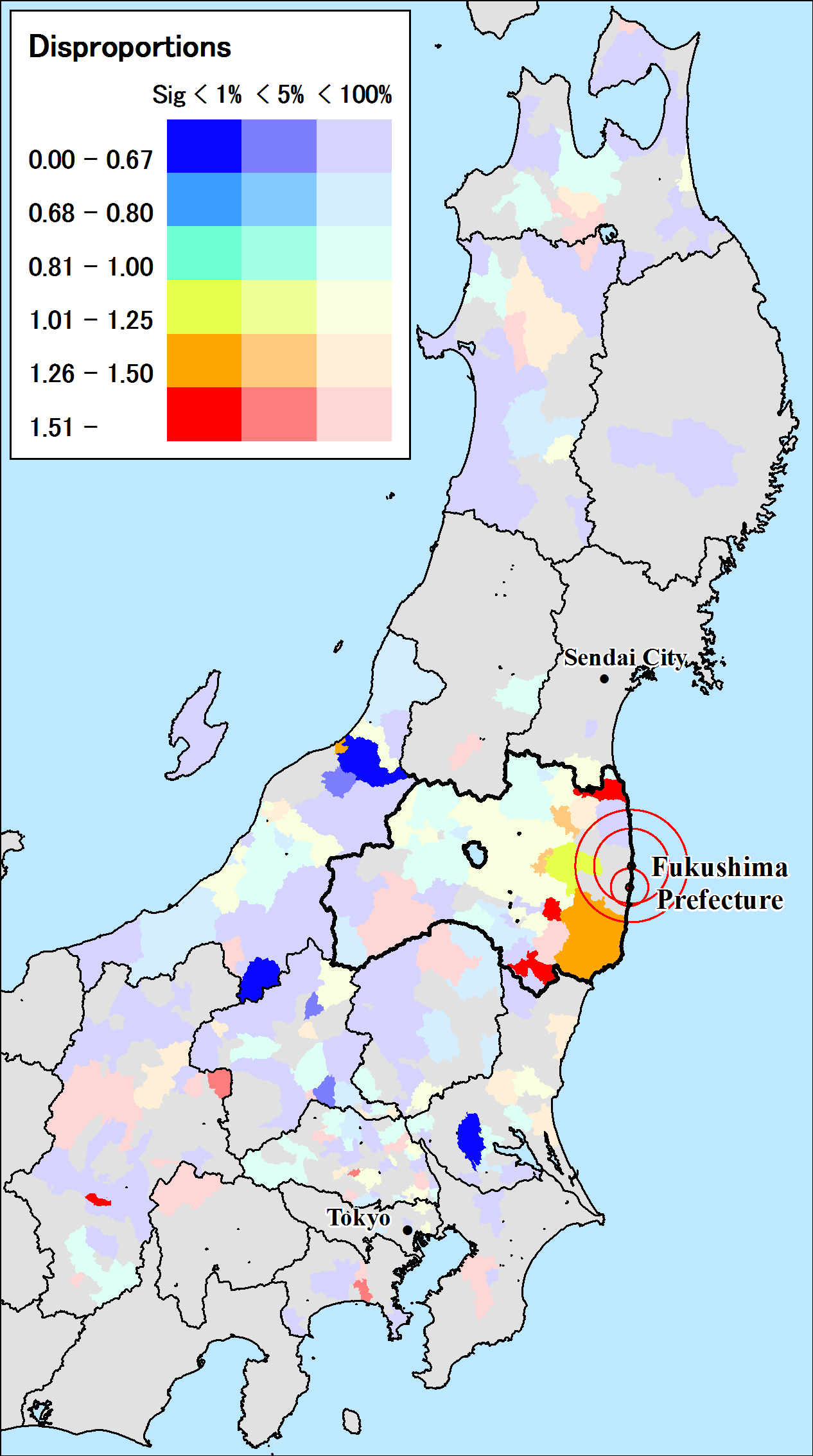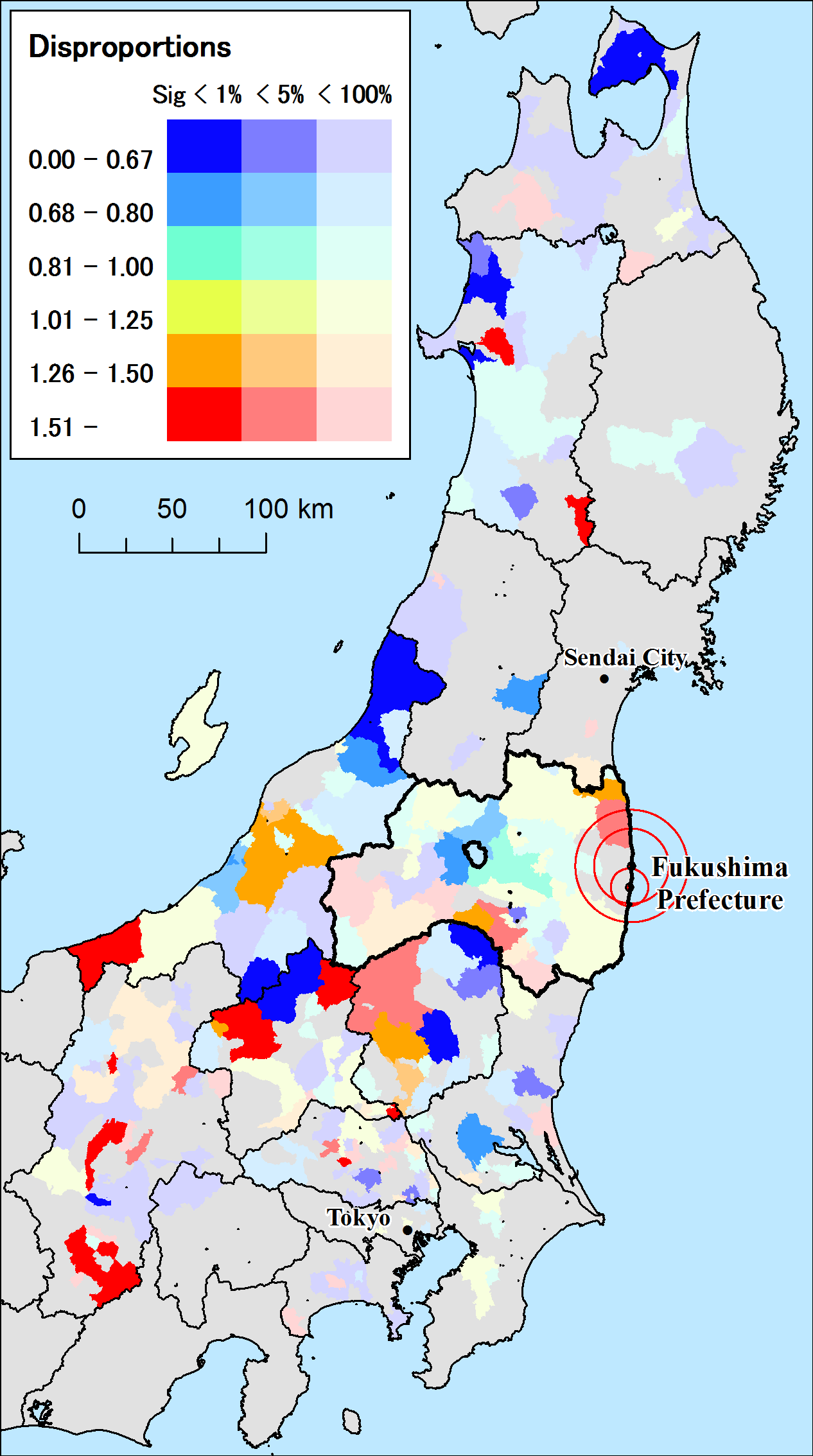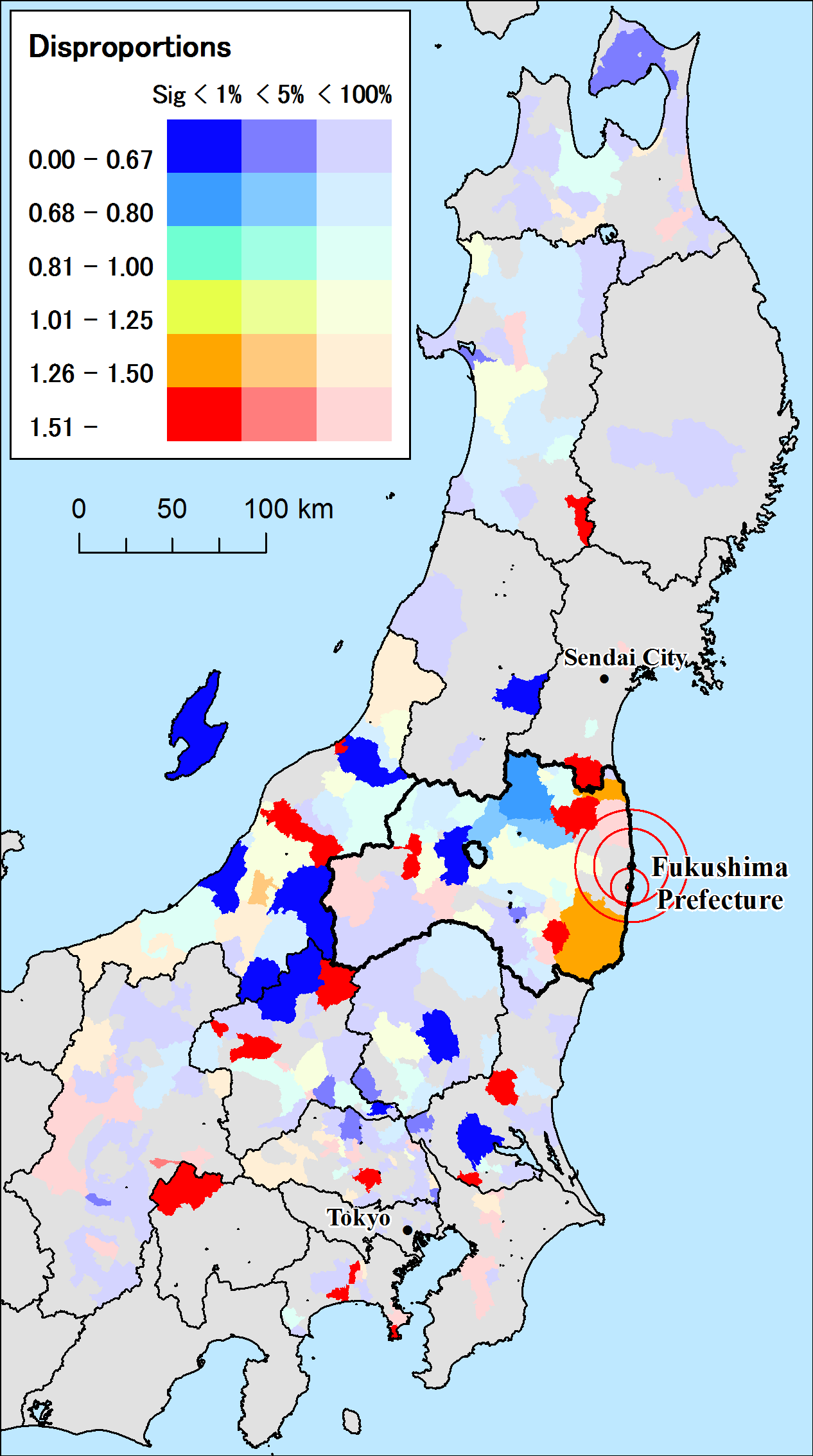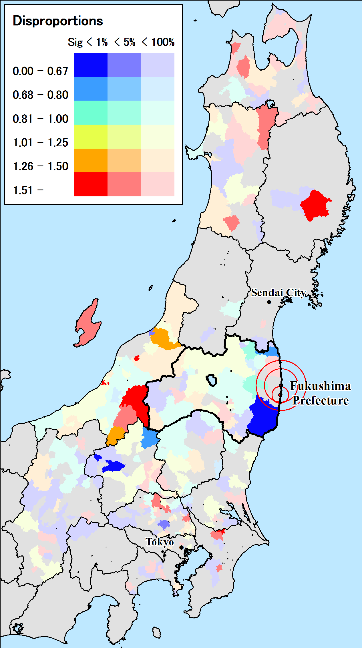 What can be imagined are that elderly who are physically frail or in need of healthcare and families with children having more desire for safe condition move to distant locations. Young workers might also opt for seeking jobs in large cities assuming that crisis would persist for long time. To examine these, sex and age composition of evacuees in each locations are analyzed using a method similar to my earlier article in this Bulletin. A proportion of evacuees having an attribute in a location is standardized by the proportion of evacuees having the same attribute in all locations (less location in question, to be more precise), calling this a 'disproportion' of an attribute. A disproportion value of 1 means that the proportion of an attribute in an location is the same with overall proportion of that attribute; value more than 1, say 1.5 means that the proportion the attribute is 1.5 times greater; and a value less than 1, say 0.66…(=1/1.5) means that the proportion of that attribute is 2/3 of the overall proportion. This 'disproportion' value for selected age and sex combination is mapped in figures 3-8. Since the number of evacuees could be small in each location, level of statistical significance is also indicated by the vividness of the colors.
