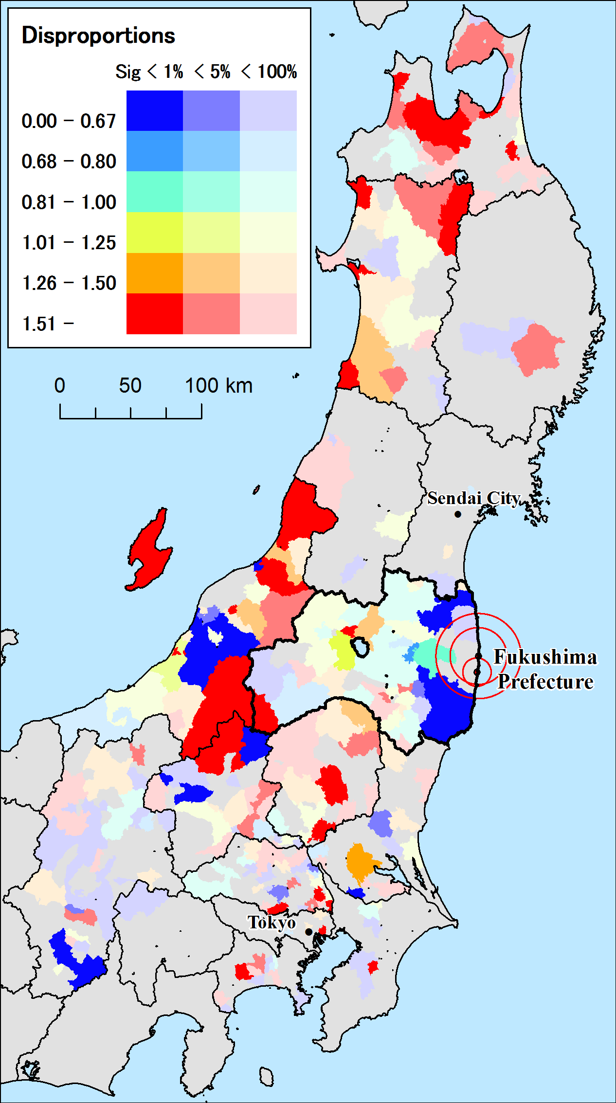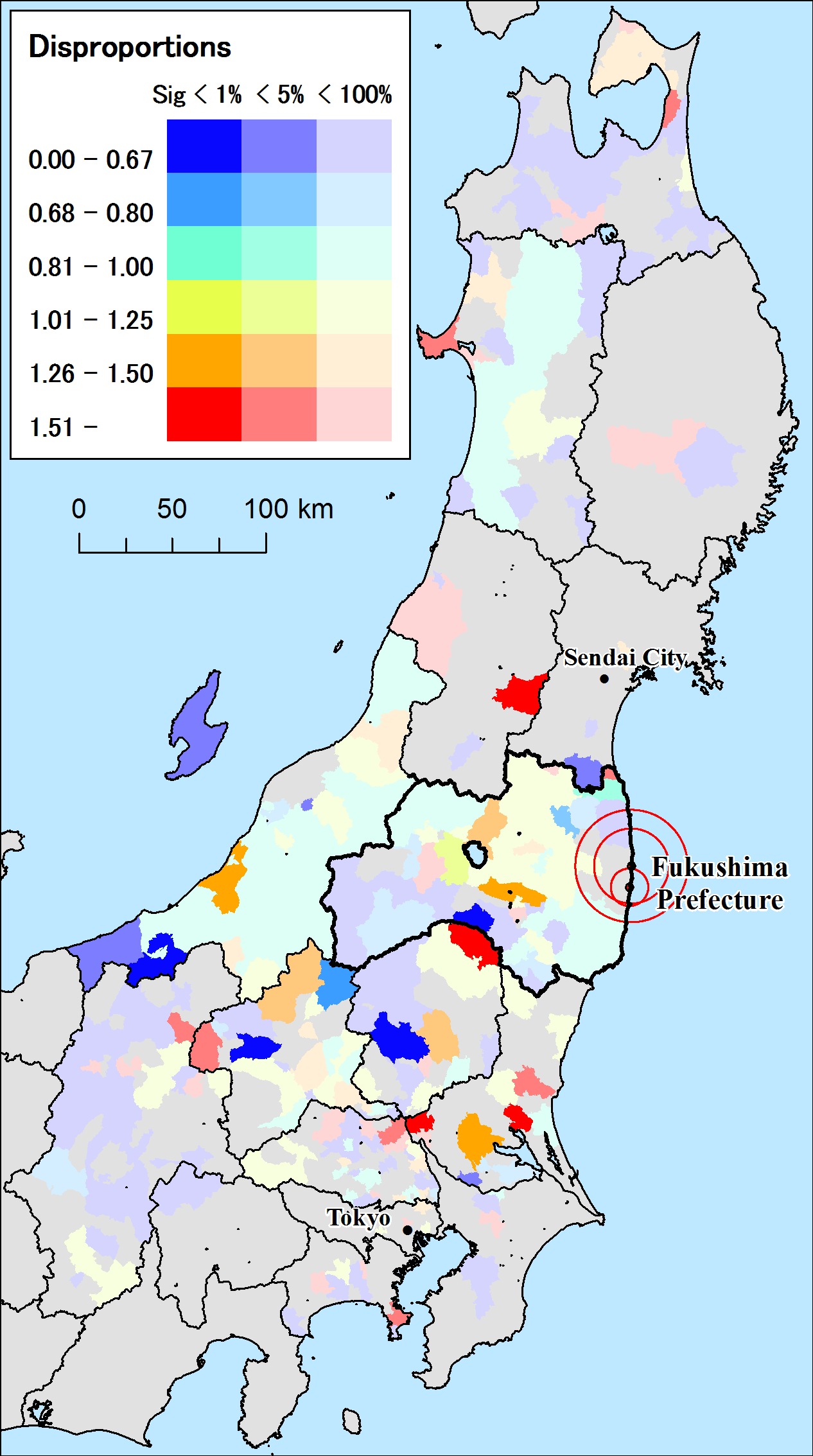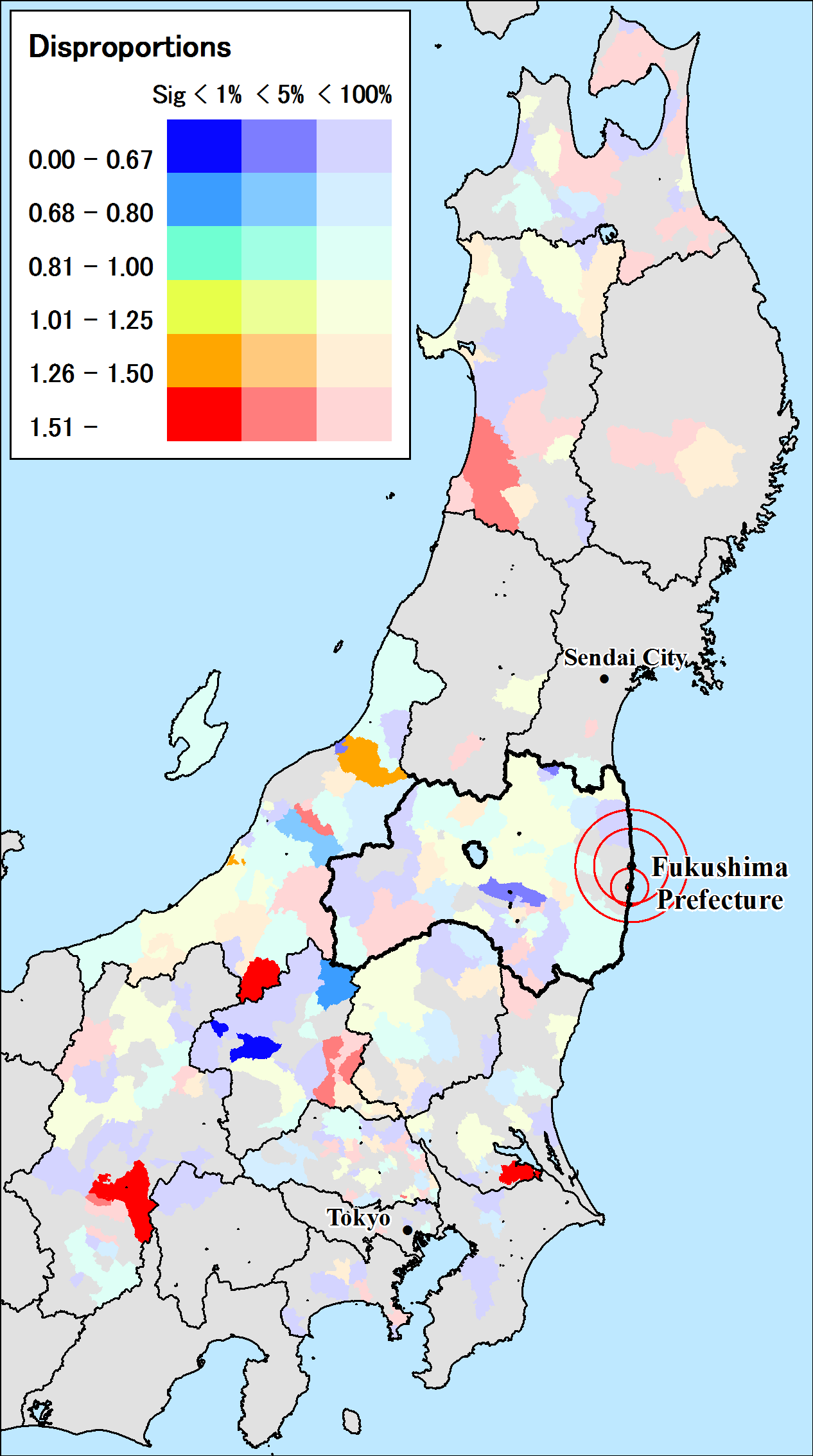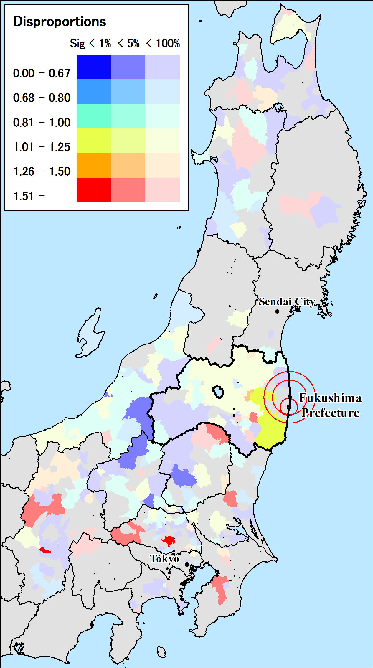 What can be imagined are that elderly who are physically frail or in need of healthcare and families with children having more desire for safe condition move to distant locations. Young workers might also opt for seeking jobs in large cities assuming that crisis would persist for long time. To examine these, sex and age composition of evacuees in each locations are analyzed using a method similar to my earlier article in this Bulletin. A proportion of evacuees having an attribute in a location is standardized by the proportion of evacuees having the same attribute in all locations (less location in question, to be more precise), calling this a 'disproportion' of an attribute. A disproportion value of 1 means that the proportion of an attribute in an location is the same with overall proportion of that attribute; value more than 1, say 1.5 means that the proportion the attribute is 1.5 times greater; and a value less than 1, say 0.66…(=1/1.5) means that the proportion of that attribute is 2/3 of the overall proportion. This 'disproportion' value for selected age and sex combination is mapped in figures 3-8. Since the number of evacuees could be small in each location, level of statistical significance is also indicated by the vividness of the colors.