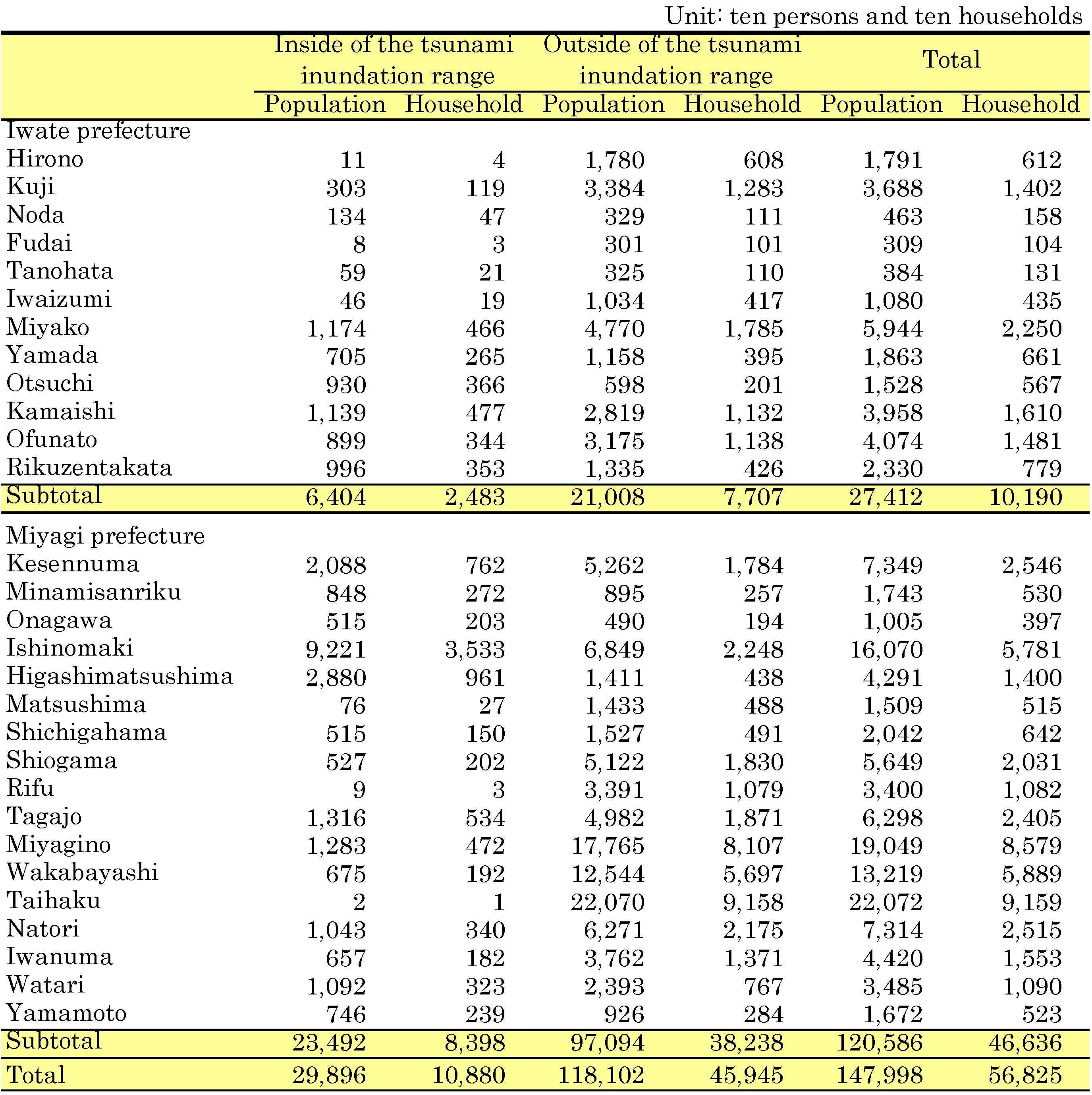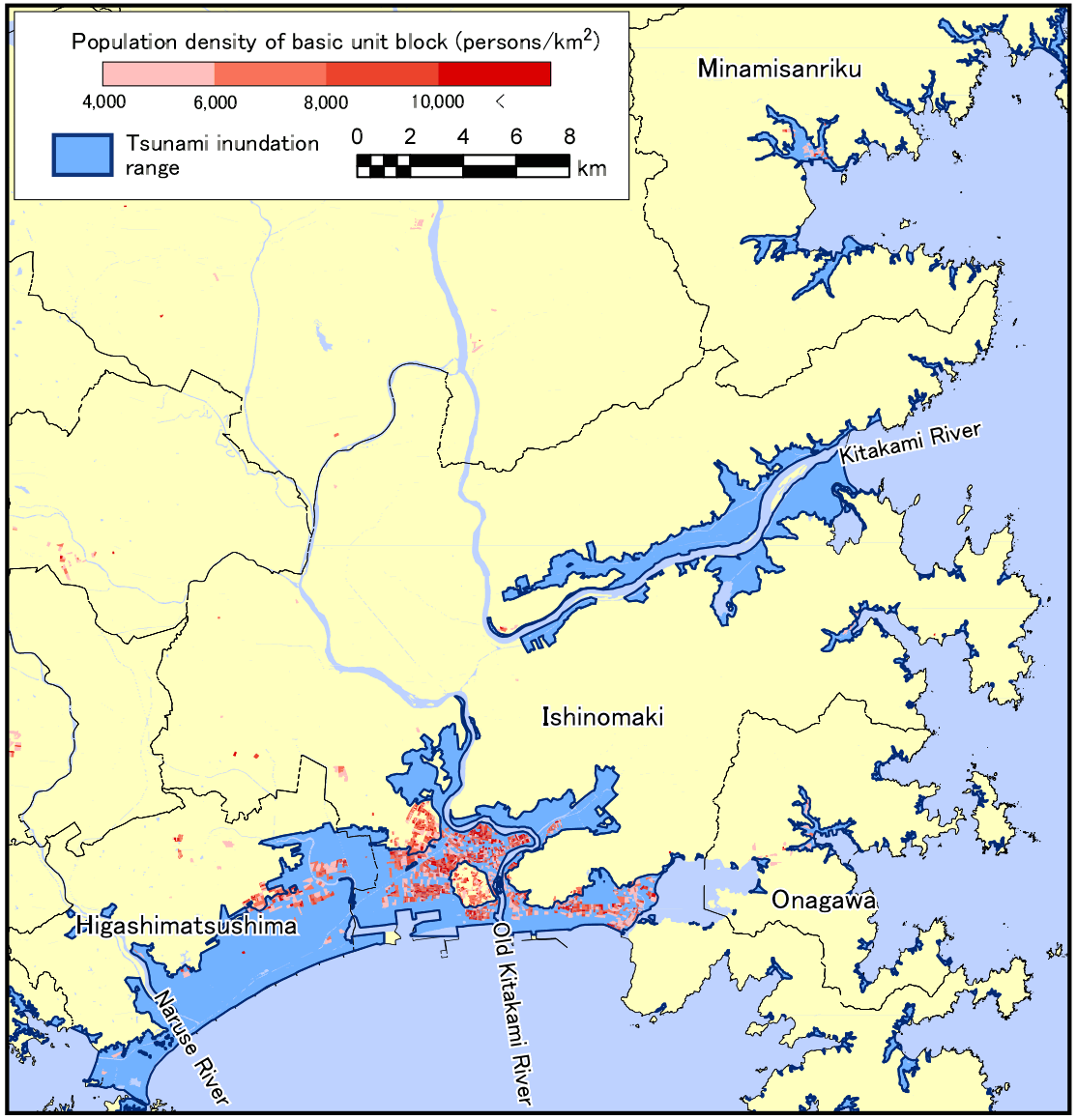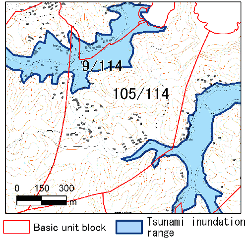 ObjectiveHuge tsunami waves accompanying the 2011 off the Pacific coast of Tohoku Earthquake that occurred on March 11, 2011 caused severe damage to the Pacific coast in the Tohoku and Kanto districts. Because stricken areas extend widely, all aspects of the damage have not been comprehended yet, even more than one month after the earthquake. This study elucidates the night population of the tsunami inundation range before the calamity based on 2010 Population Census results. The information provides clues to understanding the scale of damage level and provides basic data to support restoration plans.Data and procedures used for this work are described below. Data(1) Tsunami inundation rangeThe "Maps of the area hit by the tsunami of 11 March 2011, northeast Japan"1) was prepared by the tsunami damage mapping team of the disaster task force of the Association of Japanese Geographers (AGP). Permission to use the data was granted by the team. The author supplemented them with data based on satellite images of the disaster areas2) obtained from Google for some areas of the Sanriku coast, Iwate, which are not shown in the AGP map. (2) Demographic statistics Night population and the number of households from the 2010 Population Census (preliminary figures) were obtained for areas demarcated by the boundaries of basic unit blocks (census blocks) under consolidation3). Permission for use was granted from the Statistics Bureau, the Ministry of Internal Affairs and Communications for disaster analysis. ProcedureOverlay processing was performed using data (1) and (2) with GIS. The population was summed separately for areas inside and outside of the tsunami inundation range. The population of basic unit blocks that are partially inundated was divided proportionally to populations inside and outside of the tsunami inundation range4), according to a) areas in basic unit blocks comprising densely built-up areas in 1:25,000 topographic map; otherwise, b) the number of buildings obtained by Fundamental Geospatial Data (accuracy level 25,000). In all, 29 local governments in the coast area of Iwate and Miyagi prefectures were chosen as the subject of summation, where the data of tsunami inundation range are available in data (1).Similar summation work has already been conducted by Prof. Kenji Tani of Saitama University5) and the Statistics Bureau6). The former includes Fukushima prefecture in the subject for the estimate based on the original data of the tsunami inundation range, although the statistical data that were used are grid square statistics in 2005. However, the latter, counted by the Statistics Bureau, uses summed results according to basic unit blocks of the 2010 Population Census (preliminary figures), as this study does. No proportional division of population was conducted for basic unit blocks that were partially inundated by the tsunami. ResultsThe night population in the tsunami inundation range was estimated using the procedure described above: approximately 64,000 in 12 locally governed areas along the coast of Iwate prefecture (23.3% of the total population of 12 locally governed areas, and 4.8% of the total population of Iwate), and 235,000 in 17 locally governed areas along the coast of Miyagi prefecture (19.4% of total population of 17 locally governed areas, and 10.0% of the total population of Miyagi) (Table 1).