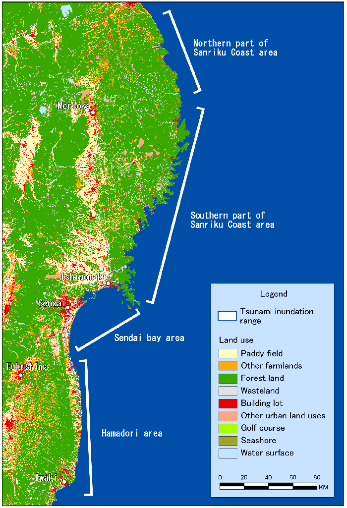 The northern part of the Sanriku coast area has developed coastal terraces and sea cliffs facing the Pacific Ocean. Terraced plains are used mainly for agriculture and stock farming. In contrast, the southern part of the Sanriku coast area comprises typical ria coasts with an intricate coastline, with little plain land except for bay heads. Sanriku offshore is famous as one of the best fishing grounds in the world. Fishing ports are established in bay heads as fishery bases, and manufacturing facilities such as fishery processing are located in the hinterland. The population and economic activity of this area are concentrated into narrow plain lands at bay heads. Alluvial plains formed by stream deposits extend from the Kitakami, Natori, and Abukuma rivers. They are usually used as paddy fields in the Sendai Bay area. Sendai city, located in this area, is the largest city in the Tohoku district. Its urban areas have continued to expand through development since the high economic growth period. However, restriction of diversion by development control from farmland to urban areas leaves broad paddy fields along the shore. Coastal cities such as Ishinomaki and Shiogama have also grown from their origins as historical port towns. In addition, Sendai Port and Sendai Airport have also developed, with industrial areas developing in different locations in the hinterlands. The southern part of this area comprises not only paddy fields but agricultural zones on beach ridges and hills. Horticulture is prosperous in the comparatively warm climates in the Tohoku district. Coastal terraces and narrow lowlands formed by rivers that engrave the terraces are located all along the coast of the Hamadori area, and city centers are located rather more inland. Coastal lowlands are used as paddy fields. Furthermore, many electric power plants were invited as economically stimulative measures in this area, including the Fukushima Daiichi Nuclear Power Plant, which suffered an accident caused by this tsunami. Iwaki, the second largest city in the Tohoku district, is located at the southernmost of the Hamadori area. Iwaki ships industrial products throughout most of the Tohoku district. Industrial areas have been sprung up around Onahama Port and other areas. Land use of the tsunami inundation rangeThe tsunami created by the 2011 Tohoku Earthquake ascended inland as far as 8 km from the seashore, flooding 561 km2 of land throughout the Pacific coast region of eastern Japan1). Regional differences are apparent in the extent of flooding by the tsunami. Although the inundation range along the Sanriku coast area was narrow, most of the plain land in the bay heads of a ria coast were flooded, and the tsunami ascended further inland along valleys. In the Sendai Bay area, the ascension distance of tsunami was particularly long and the alluvial plain spreading in front of the seashore was flooded broadly. Lowlands made up along rivers engraving coastal terraces and coastal areas of Iwaki were flooded by tsunami in the Hamadori area.
