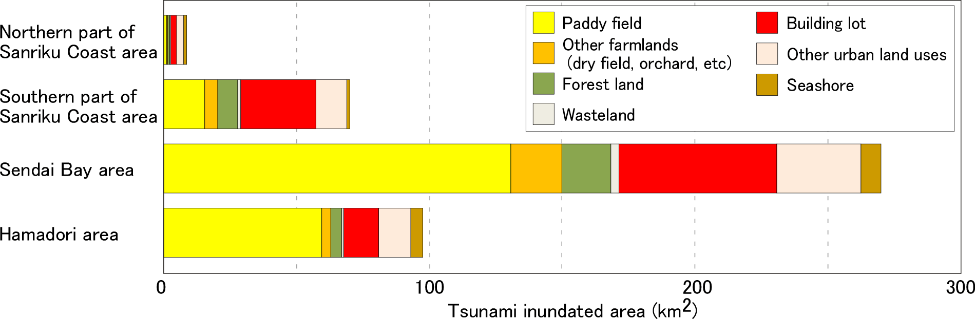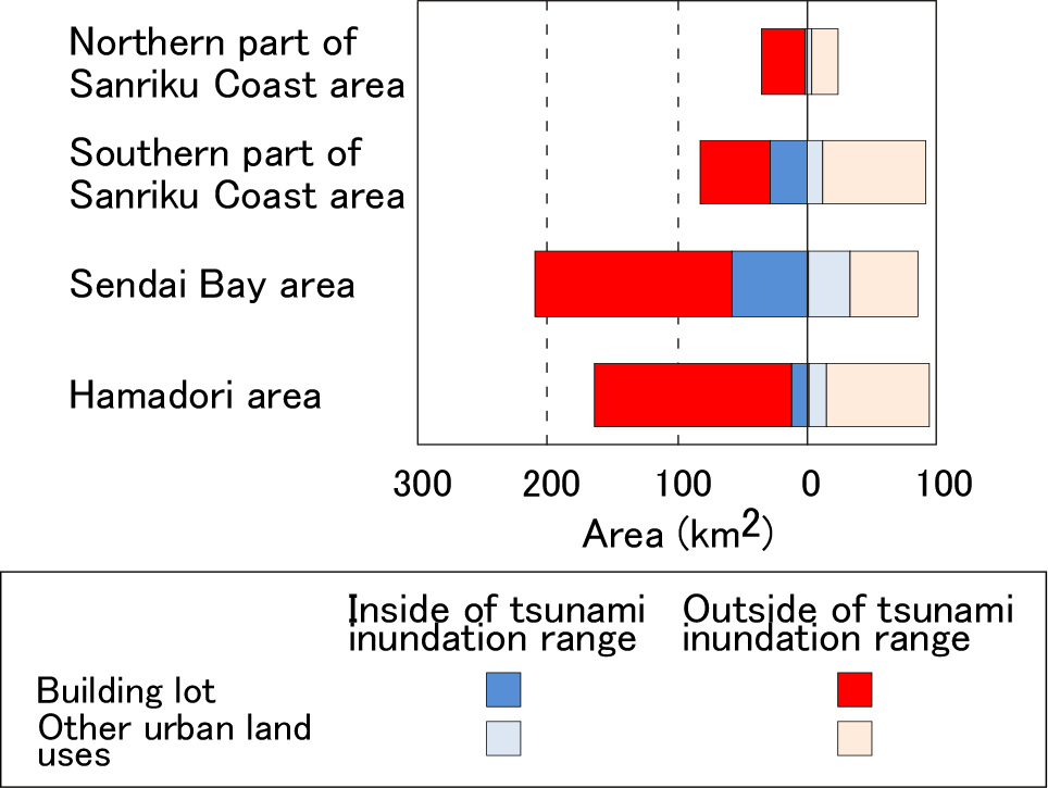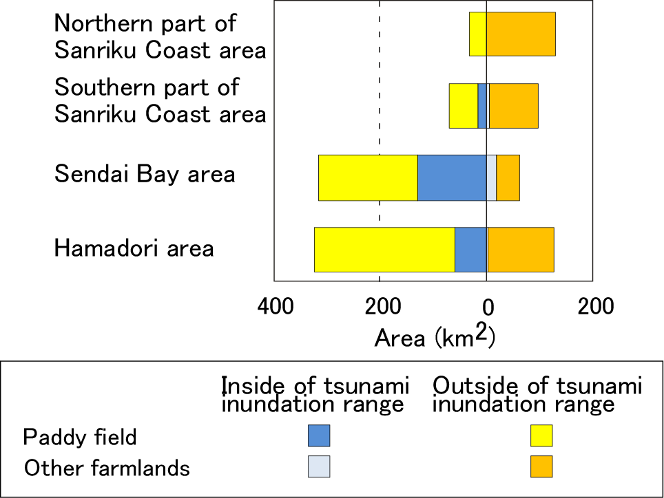 Figure 3 presents a comparison between flooded and not flooded areas within urban areas and farmlands in each area, which confirms the trend described above. With respect to urban districts, around 30% of building lots are submerged in the southern part of the Sanriku coast area and the Sendai Bay area. Other ground for urban land use was also widely flooded in the Sendai Bay area. Regarding farmland, paddy fields were severely inundated in the Sendai Bay area and the Hamadori area, 40% and slightly less than 20%, thereof 30% of other farmland (mainly fields and orchards) was also flooded in the Sendai Bay area. Tsunami damage