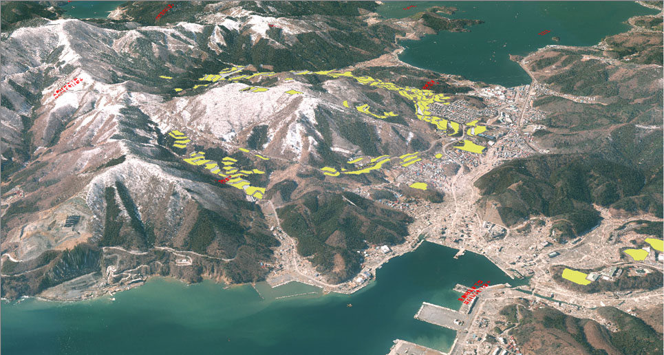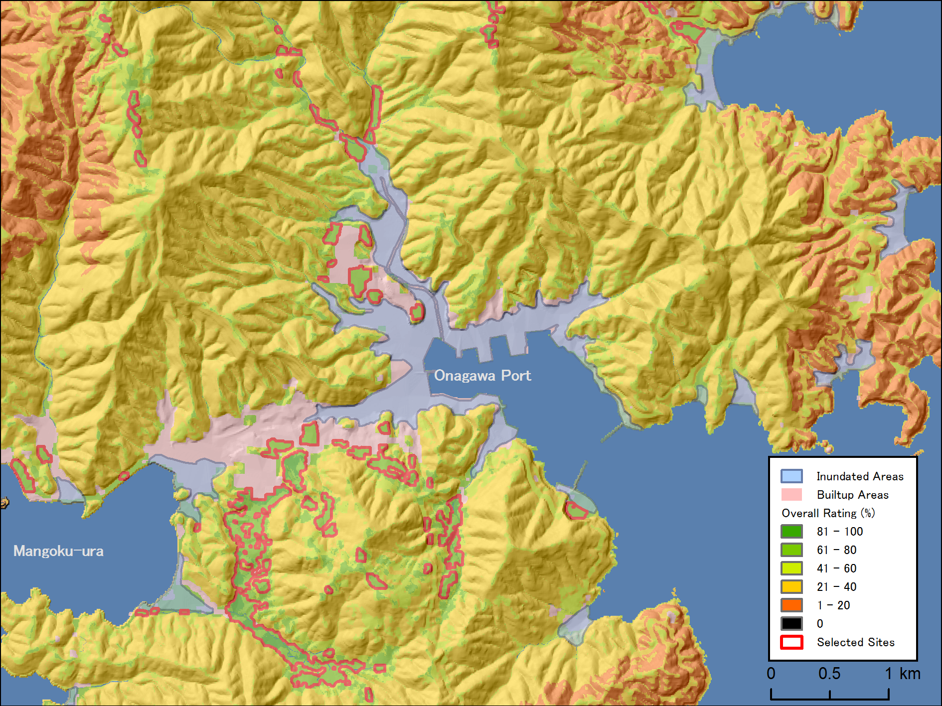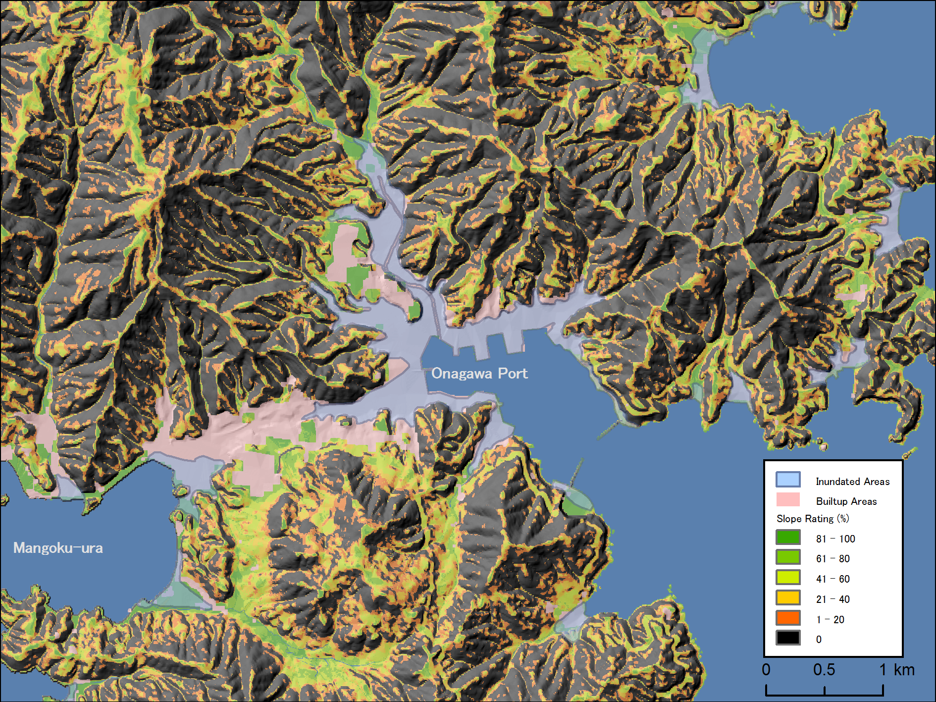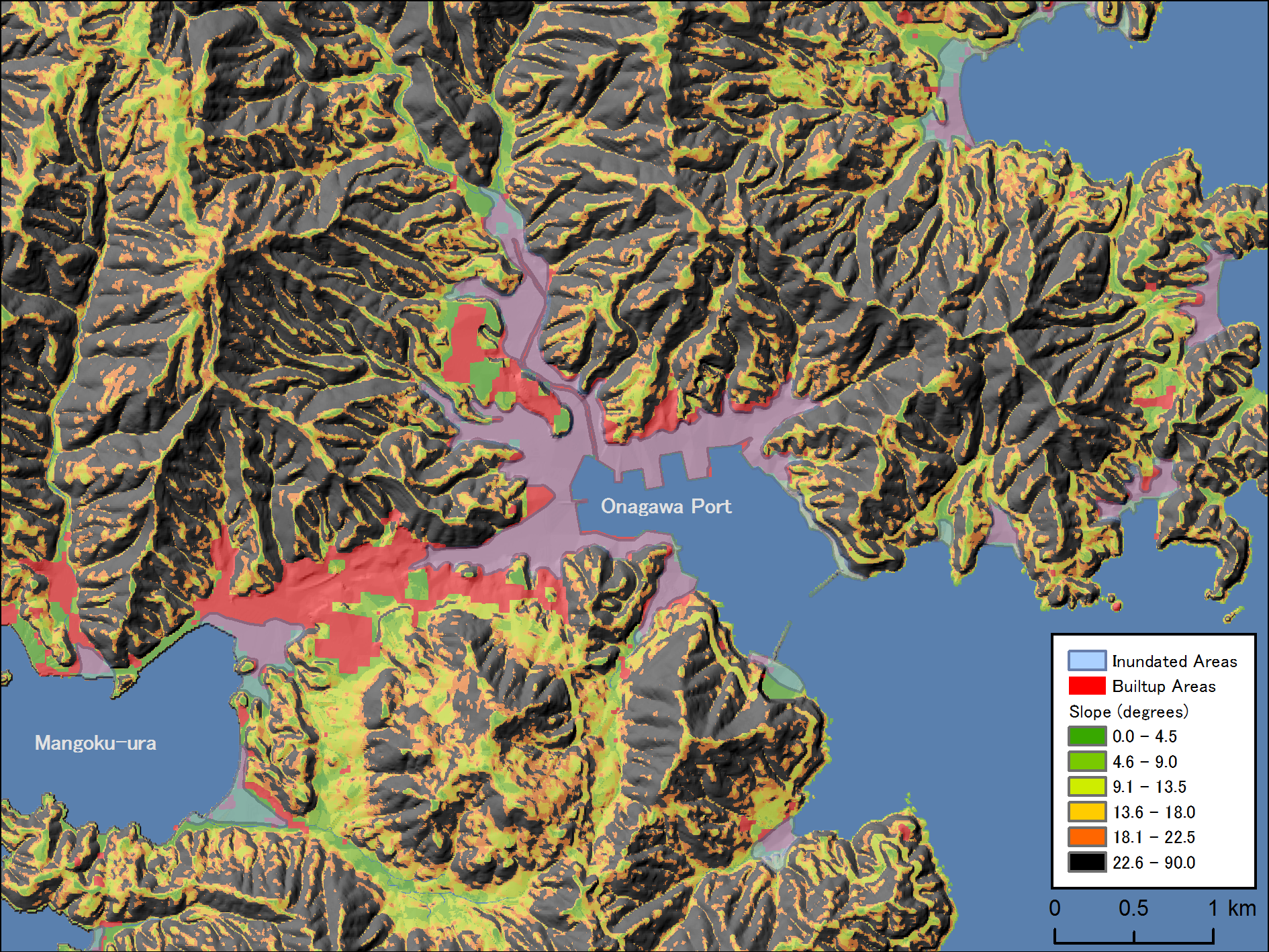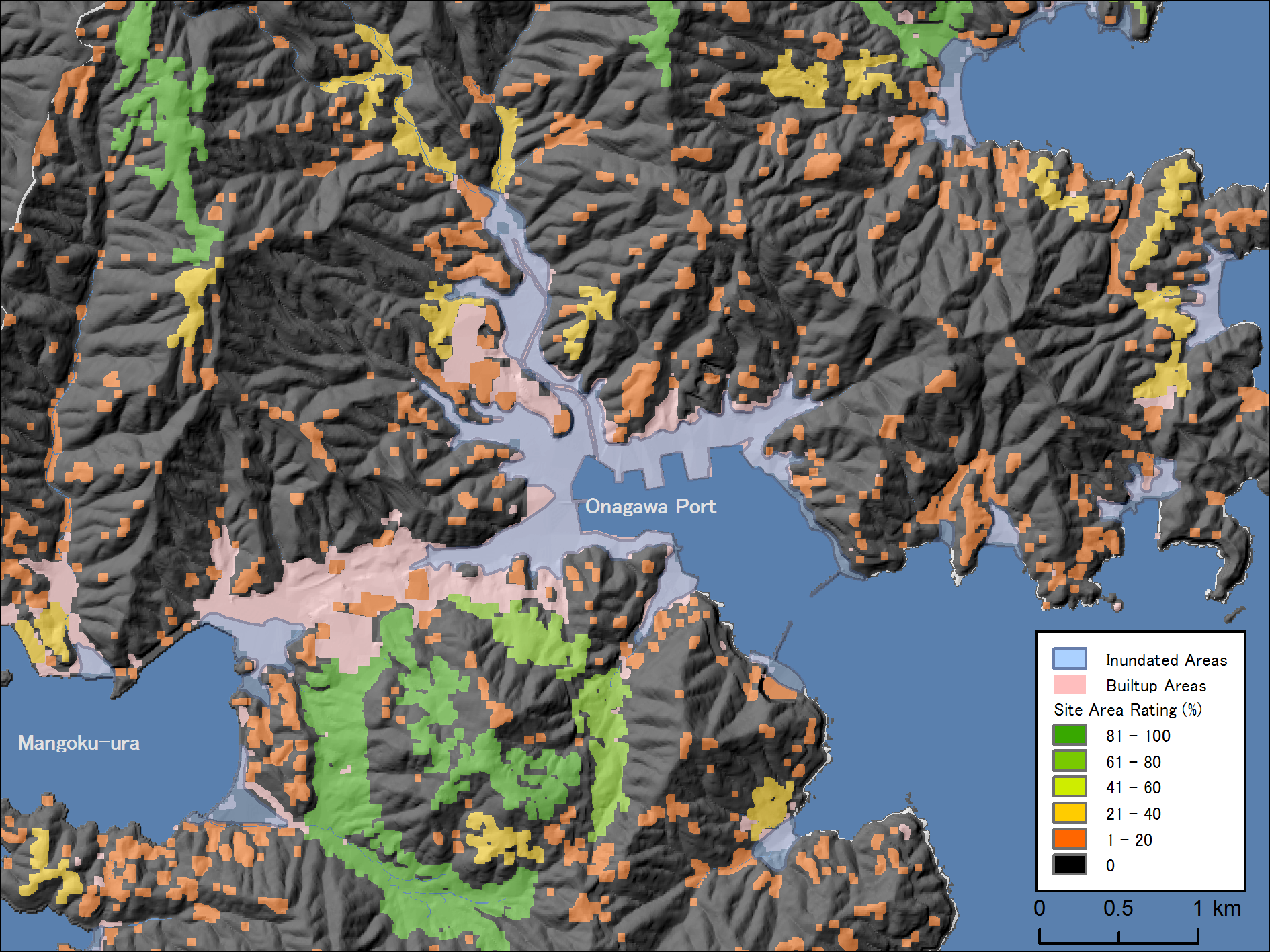 Onagawa Town had 10,051 population in 1 October 2011 of which 11% died or missing from the tsunami. The wave height was about 15 m (The 2011 Tohoku Earthquake Tsunami Joint Survey Group) at the Onagawa Port, and almost all plains were inundated, including 116.4 hectare of built-up area in the main inlet area. The area is in short of moderate slope, let alone flat plain, but the goal of this article is to find alternative land for this 116.4 hectare of built-up area.