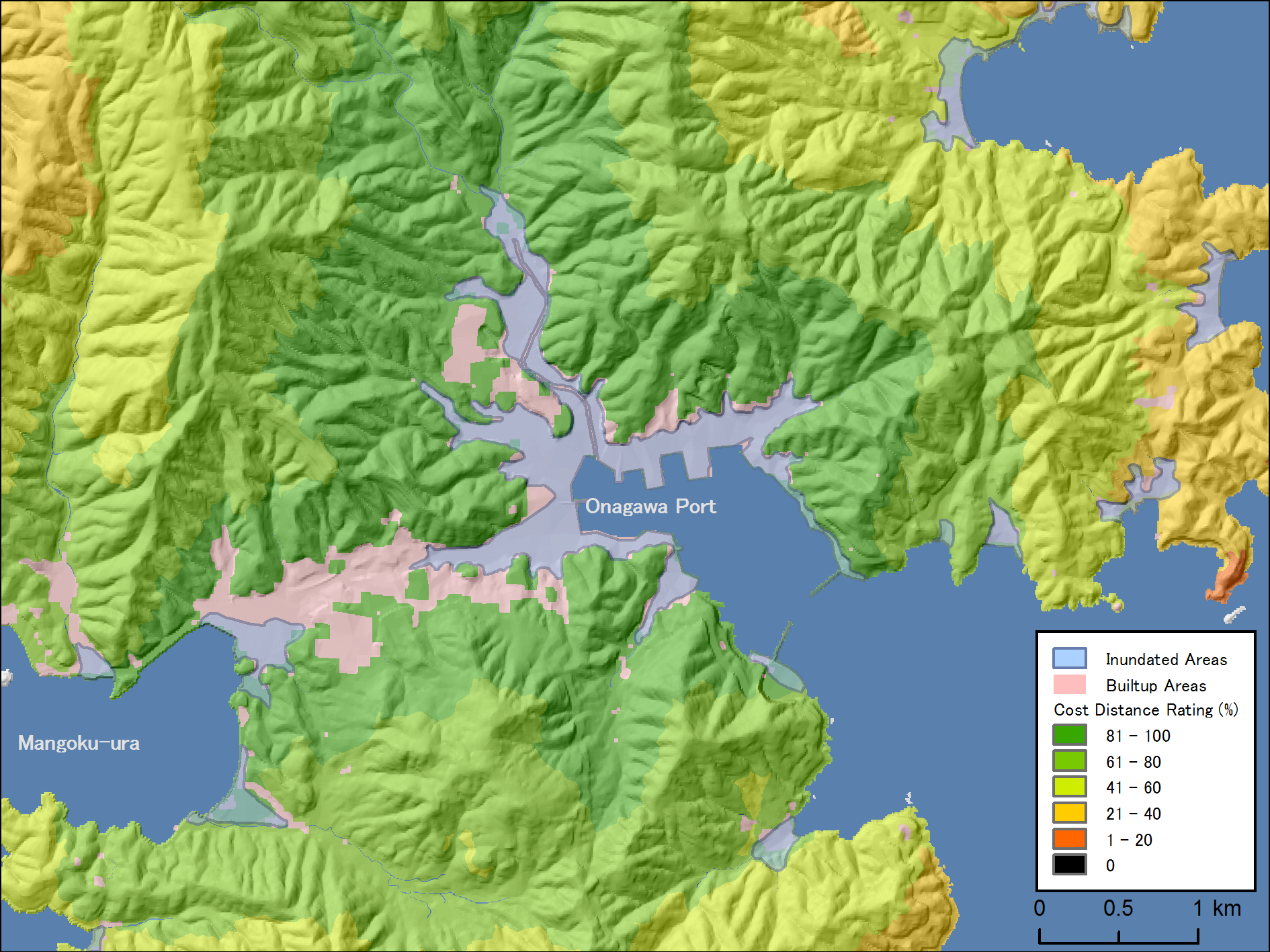 Onagawa Port for fishery and aquaculture is expected to play central role in Onagawa economy as it has been the raison-d'etre of the town. Commuting to the Port area would be the daily routine for the Onagawa citizens so the distance to the existing town center seem to be very important. I calculated cost distance from the inundated built-up area, assuming that travelling vertically is 10 times more costly than travelling horizontally, and locations were rated 0% for 0 km, and 100% for 15 km.