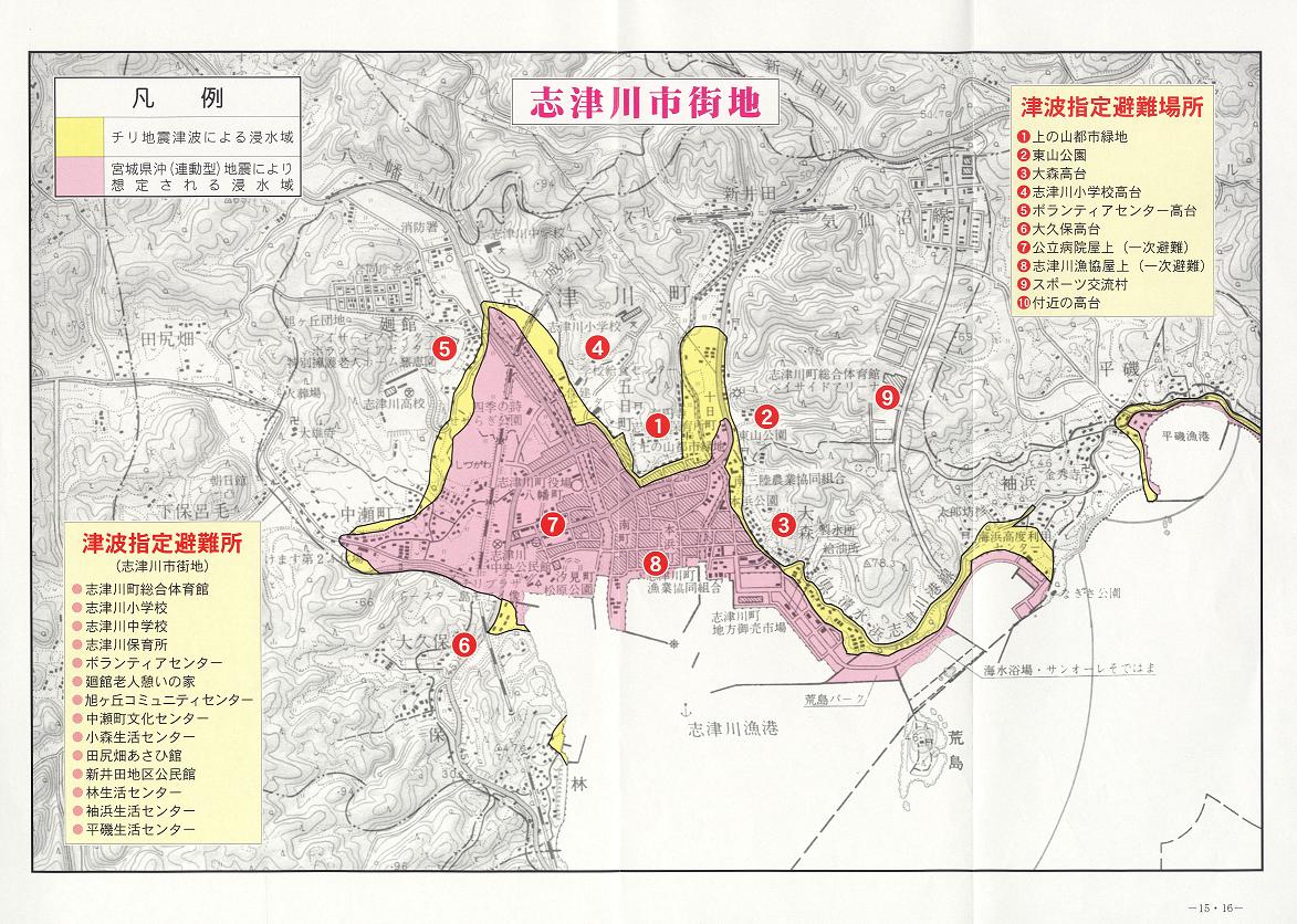 inundation from the (then forthcoming) Miyagi earthquake. This hazard map was distributed to all households. In this area, hills around the built-up area were composed with the specified refuge place in case of the tsunami. Public utilities