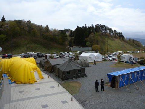 | Photo 12. Tents mushrooming around the gymnasium, 5 May, 2011 (by Ryohei