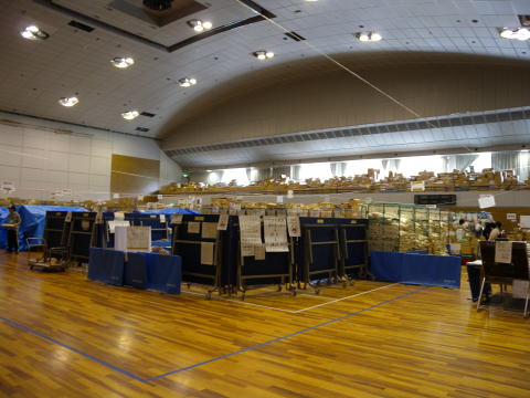 of medical support use these tents. They bring tents not to take space from evacuees. In May, the shelter turned to be a place to store mass relief supplies.