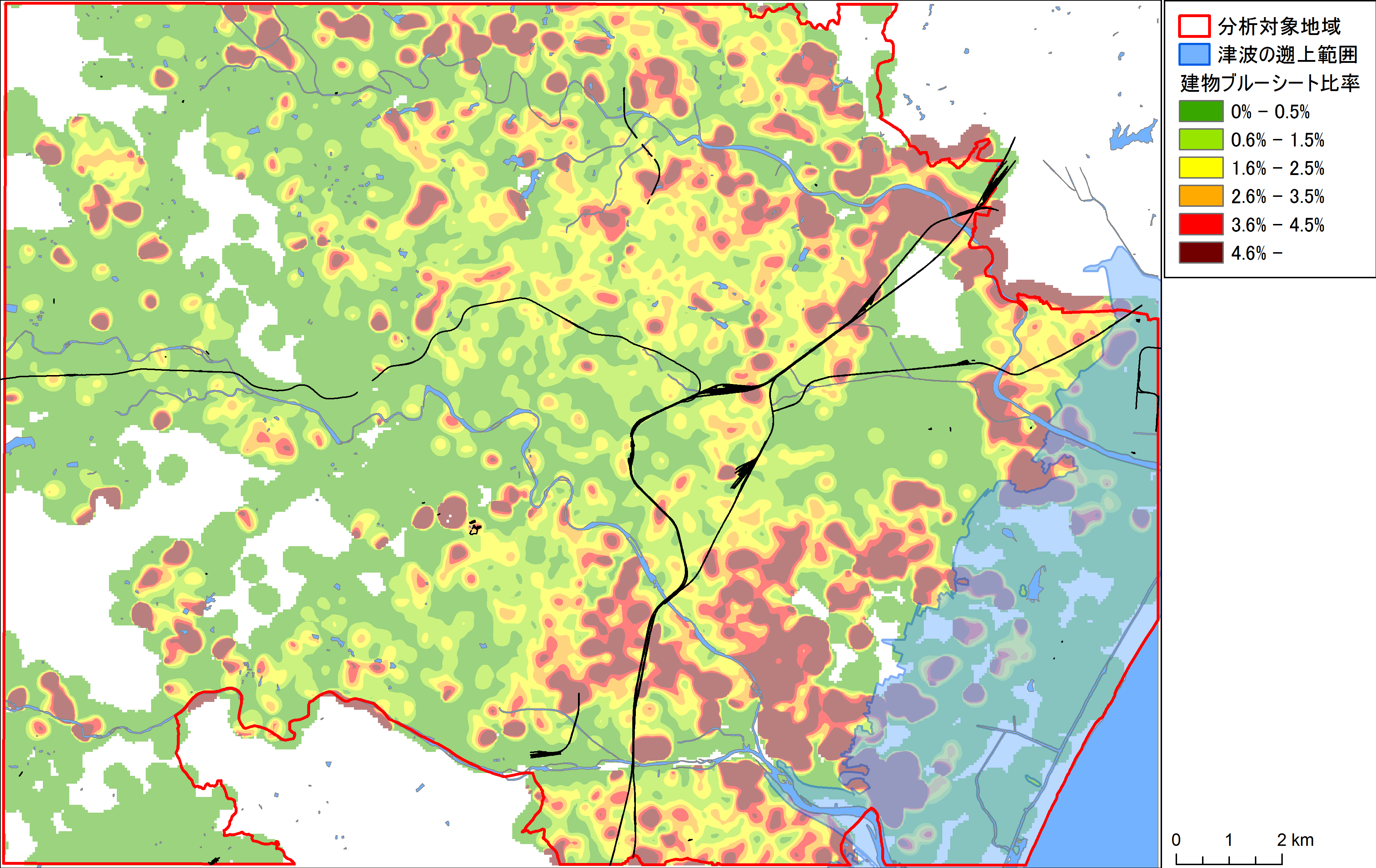 Using the blue-sheet on buildings (category 1 and 2), the point density was calculated and that was divided by the point density of buildings (Fig 1). The rate of blue-sheet in Figure 1 shows the city center is not much affected but alluvial plain in the south and that along the Nanakita river in the north is heavily affected.