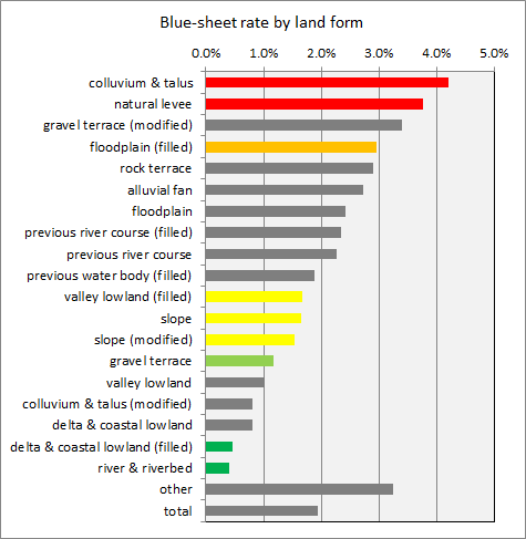 In order to examine the effect of land form on the rate of blue-sheet (i.e. the intensity of structural damage), the rate of blue-sheet is overlaid on land form category in Figure 2, and the result is shown in Figure 3.