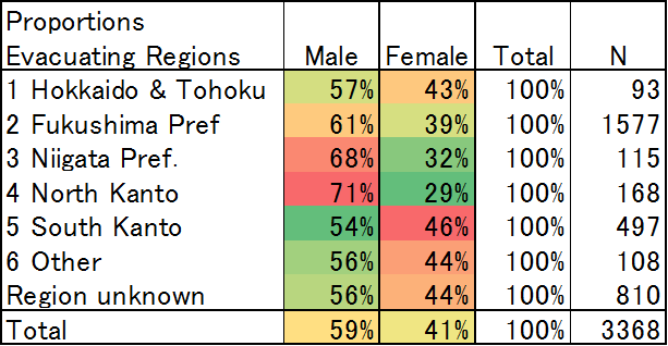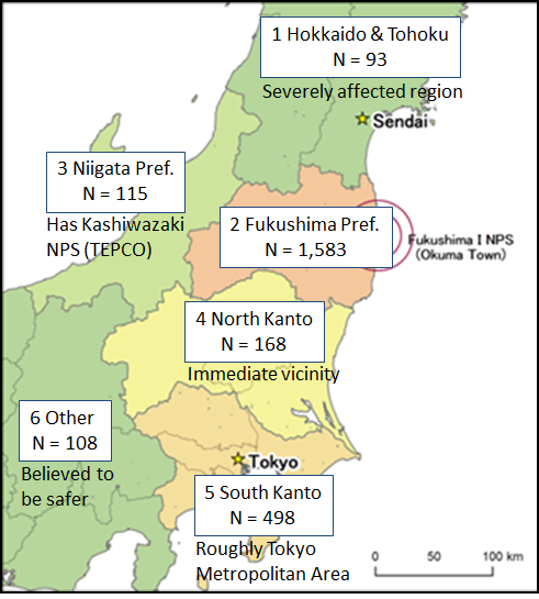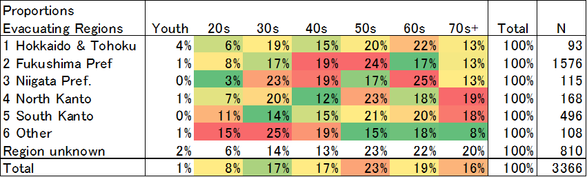 (3) Disproportionate number of young adults (in 20s and 30s) evacuated to distant locations such as South Kanto and Japan west of Kanto, while mid-career age groups (in 40s and 50s) tended to stay in Fukushima Prefecture. Disproportionate number of males in 30s and 40s evacuating to Niigata Prefecture is probably associated with personnel transfer of personnels in nuclear related businesses to there where Kariwa Nuclear Power Station, also owned by TEPCO, is situated.