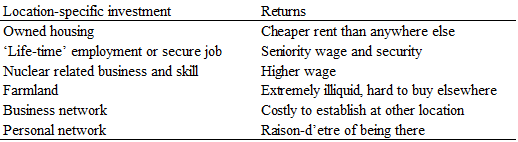 On one hand, there are many evacuees who express strong attachment to their home town despite most them seem to be convinced that they would not be able to return for at least some years. Attachment to the home town arises, according to human capital theory, because previous location-specific investment accrue greater returns than anywhere else, and that such previous investment cannot be transferred to a new location. Such investments and returns include physical and human, pecuniary and non-pecuniary items (Table 1). Starting from the physical capital, owned houses are location-specific asset as houses are almost impossible to sell at a price high enough to buy a house of similar size and quality in Japan in general, but most certainly so for a house in a region contaminated of radiation. Employees in secure job or elife-timef employment in a firm of the region would find difficulty in finding employment that pays equivalent amount; although rapidly changing, long-term employment prevalent in Japan has corollary to severe immobility of labour across firms. Items difficult to quantify and unlikely to be fully compensated for are business networks for business owners and self-employed, and personal networks for all member of the community but these are perhaps the most important reason for citizens to continue living at a place.