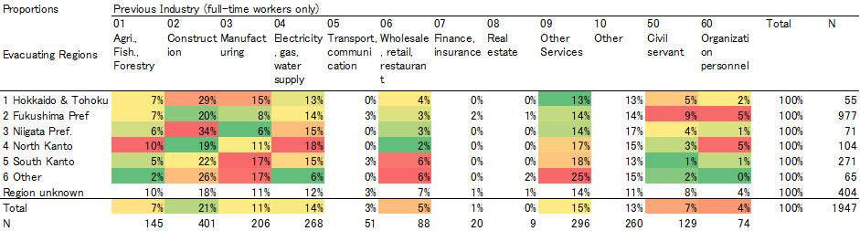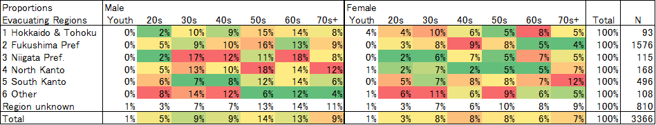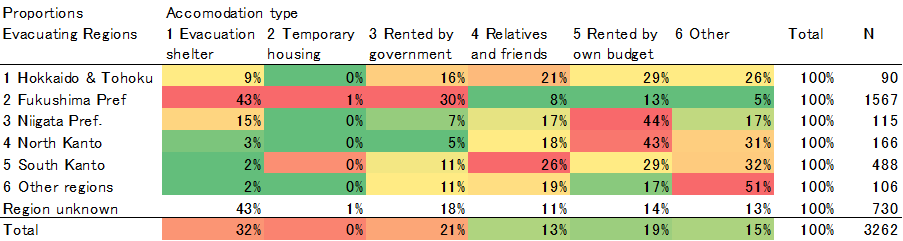 As demonstrated in Figure 2, the numbers of evacuees in various destinations are proportional to the size of the area and the proximity, as in the usual in migration patterns, so we will rather focus on selective migration. We analyse selective migration by cross-tabulating evacuees by various attributes and evacuating region, as exemplified in table 6 for accommodation type. The rates in table are proportion of evacuees in a category of an attribute in question in in each region. The colors in each cell represent high and low rates within each column, in red and green respectively, thereby indicating elocation quotientf of the rates (i.e. rates divided by a rate of column total). Rates colored in red shades indicate disproportionately more evacuees in that category in that region, and vice-versa for rates colored in green shades.