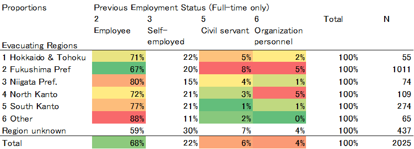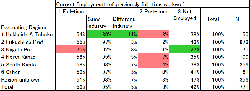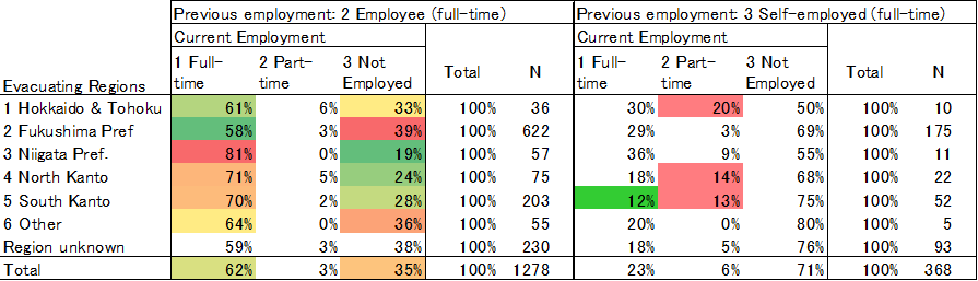 (4) Employment rate of evacuees (previously full-time workers) were not much higher in Kanto region. For speculative migrant who evacuated to Kanto region without prior job contract, the job prospect there may have been worse, as indicated by low employment rate among previous self-employed workers in the same region.