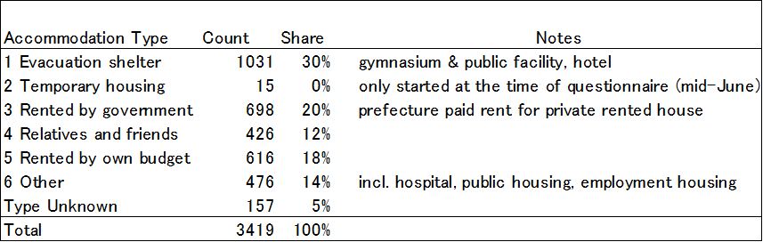At the time of survey in June, largest share of evacuees are in evacuation shelters, mostly in hotels at hot spring area and ski resort that were designated by the Okuma Town as secondary evacuation center (Table 2). Fukushima Prefecture paid hotels 5,000 yen per person per day, and evacuees are provided with food as well. At that time, about 500 temporary housing for Okuma Town was completed and allocated to households, but their move-in has just started; most households were waiting for 6 essential household electronic items, i.e. washing machine, refrigerator, TV, rice cooker, microwave oven and electronic kettle, provided by Japanese Red Cross Society, and thus very few were in temporary housing yet; most evacuees in evacuation shelters should have moved in to temporary housing, at the time of writing. Fukushima Prefecture also paid rent to those renting a private rented house in Fukushima Prefecture.