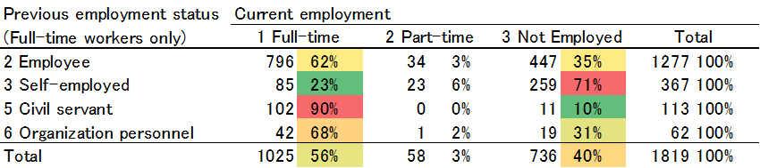 In the further analysis of job availability in this article, we use the rate of employment/unemployment of previous full-time workers. Looking at current employment by previous employment status of previous full-time workers, unemployment of previous self-employed workers are much higher than that of previous employee of private firms, while 90% of previous civil servants (municipal, prefectural or national) are employed. eOrganization personnelf in table 4 are those working in not-for-profit corporations, and their rate of unemployment is similarly low. We found a case of employee in Futaba Japan Agricultural Cooperative (JA) transferred to Fukushima JA or school teachers transferred to other school in Fukushima Prefecture, in the interview.