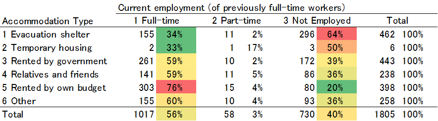 Cross tabulation of employment by accommodation type show that unemployment is highest among those in evacuation shelters, as hot spring hotels and ski resort designated as secondary evacuation facility were away from employment opportunities and local economy did not have (if any) job openings for suddenly increased job seekers (table 5). On the other hand, unemployment is lowest among those rented house by own budget. While this seem to indicate that those paid more for housing at locations with more employment opportunity actually got jobs, the causation is more likely to be in reverse. Those who are engaged in job through personnel transfer or found alternative job were able to rent house by their own expense while those who are not engaged remained in the evacuation shelters.