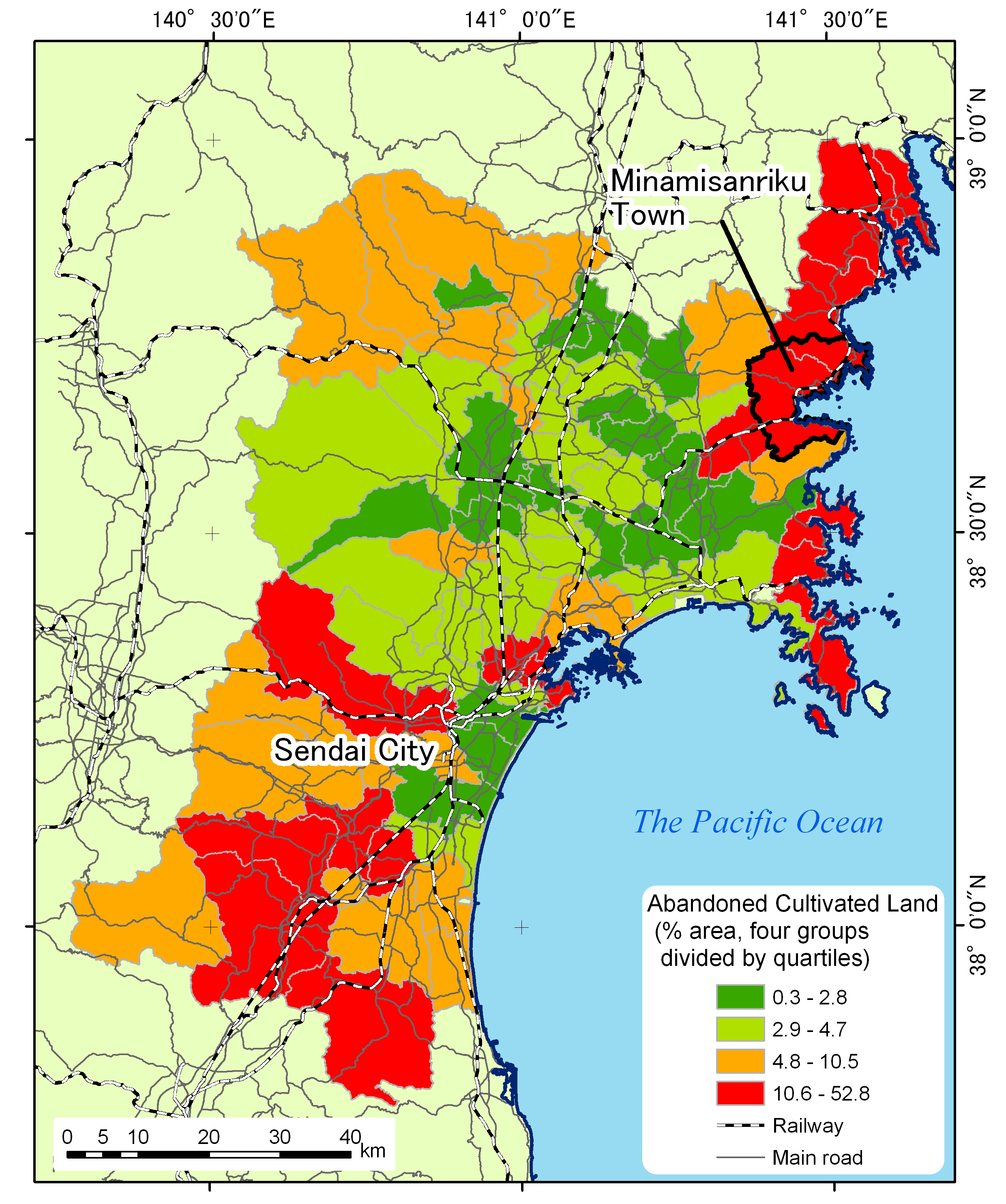 Relocation of housing from the tsunami- devastated lowlands near the seashore (Photo 1) to elevated land is among the ideas that will be discussed in a government-convened council of officials from the quake-hit regions and city planning experts1. The housing relocation in the Sanriku coastal areas will change the land use pattern of the elevated areas presently with the combination of homesteads, cultivated fields and forest plantation. Abandoned cultivated land in these areas is a possible location for settlement reconstruction. Especially since the early 1990s, the abandoned land has expanded in the process of rural depopulation and ageing. In Miyagi-ken (Figure 1), one of the Prefectures devastated by the 2011 East Japan Earthquake, the abandoned cultivated land started to expand in its southern part where upland farming is more prevalent and the area of farmland per agricultural household is relatively small. In north Miyagi, while paddy rice cultivation has slowed down the field abandonment to some extent, the Sanriku coastal area with the southern edge of Kitakami Mountains has undergone substantial upland farm abandonment where paddy cultivation is minimal. The percentage of abandoned land to the total farmland was very high in the former Utatsu Town (33.8% in 2005), now a part of Minamisanriku Town (population in February 2011: 17,666), which was among those hardly hit by tsunami. In its Tomarihama settlement (about 600 residents), wheat price decrease after the mid 1980s accelerated field abandonment, and fishery and guest-house management for tourists became more important, thus expanding abandoned fields2.