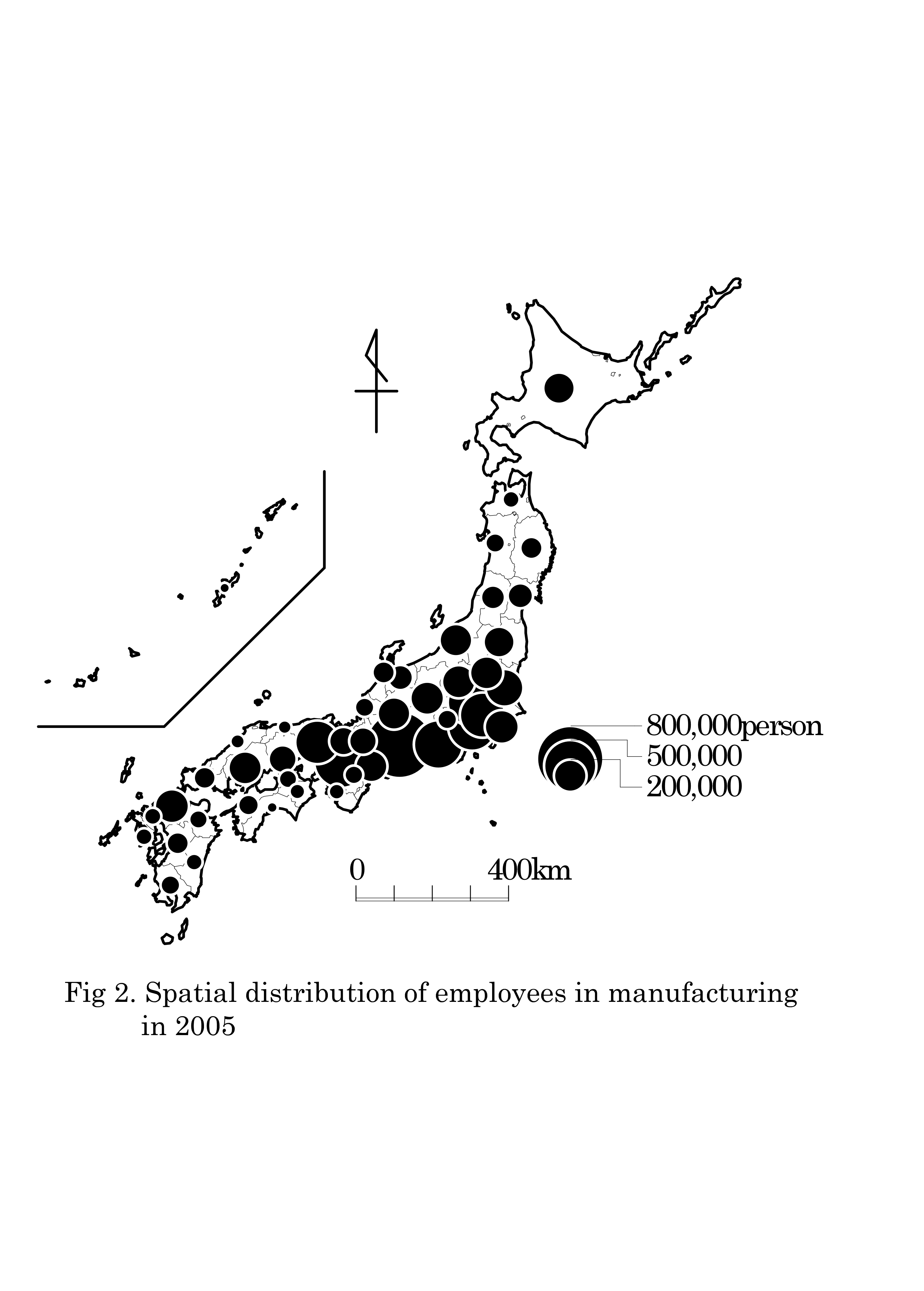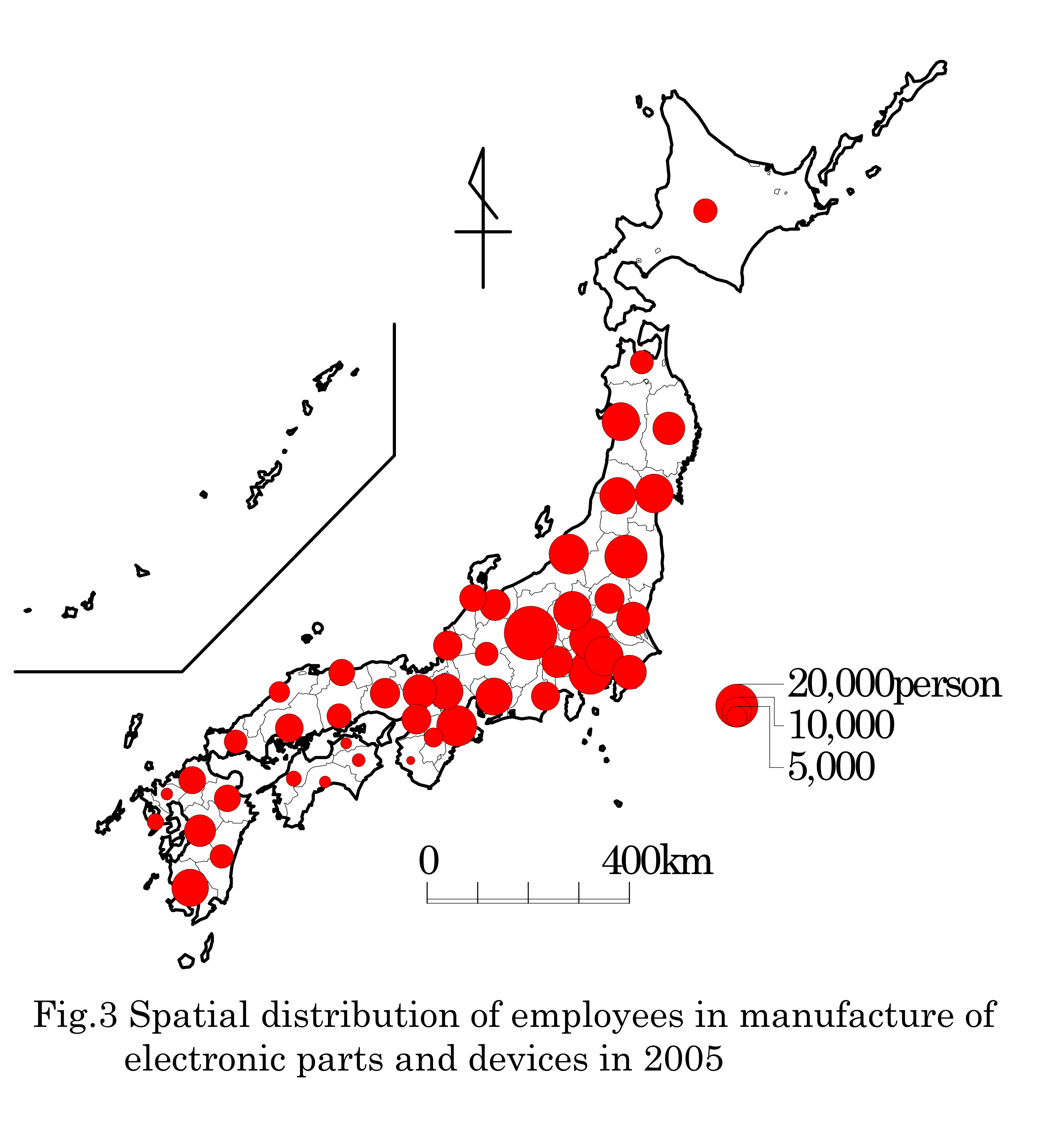 Fig.2 shows the distribution of manufacturing on number of employees in Japan. The manufacturing still concentrates remarkably into Tokai-do Megalopolis that extends from the Tokyo metropolitan area in the east to the Osaka metropolitan area in the west. The Tokai-do Megalopolis occupied 63 percent of all employees in manufacturing in Japan in 2005. On the other hand, the share of Tohoku remained only eight percent. The share of Tohoku, however, became 17 percent if industries were limited to the manufacturing of electronic parts and devices (Fig.3). Products in these industries are used as parts of automobiles. Furthermore, a lot of parts plants of key machinery apparatus of car are located in Tohoku, too.