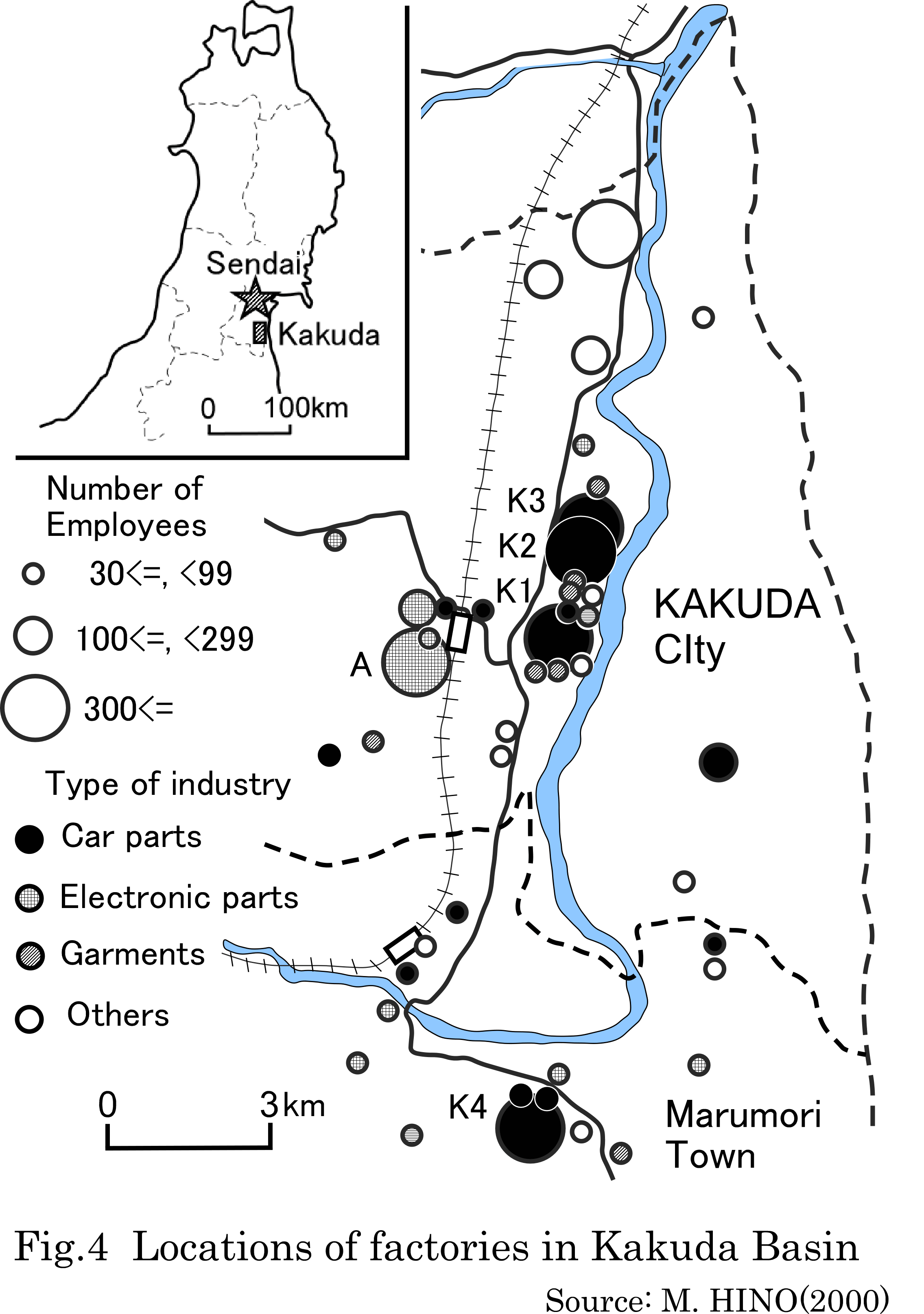 Fig. 4 shows locations of factories in Kakuda Basin at the end of 1990s. Kakuda Basin is located about forty kilometers south from Sendai. A lot of small and large factories producing car parts and electronic parts are located in this area. Alps, one of main Japanese companies producing electronic parts, established its branch factory in this area in 1967, and then Keihin, a subsidiary of Honda producing car parts, did its branch in 1969. These two companies formed the agglomeration of parts plants through organizing their own local production systems. At present, Keihin sets both some functions of headquarter and research and development section in addition to producing function in Kakuda. Both Alps and Keihin are international companies with their subsidiaries in the world now. When they established their branch factories in Kakuda, however, they were domestic companies whose factories were located in Eat Japan. Therefore, their production may be shifted more to the oversea with this earthquake as a trigger.