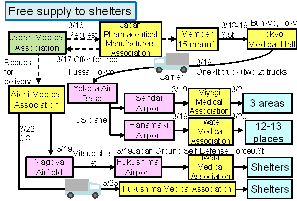一方,日本製薬工業団体(製薬協)など業界団体は対策本部を設置し,必要な医薬品を届けるための配送手段の確保に努めた。無償提供の医薬品は,3月16日,日本医師会の依頼を受けて製薬協加盟の製薬企業を通じて空路および陸路で(Fig. 2),3月18日,厚生労働省の依頼を受けてチェーンドラッグストア協会とOTC医薬品協会を通じて水路で,3月23日,岩手県,宮城県,福島県の供給要請を受けて,製薬協加盟の製薬企業を通じて陸路でそれぞれ配送された。